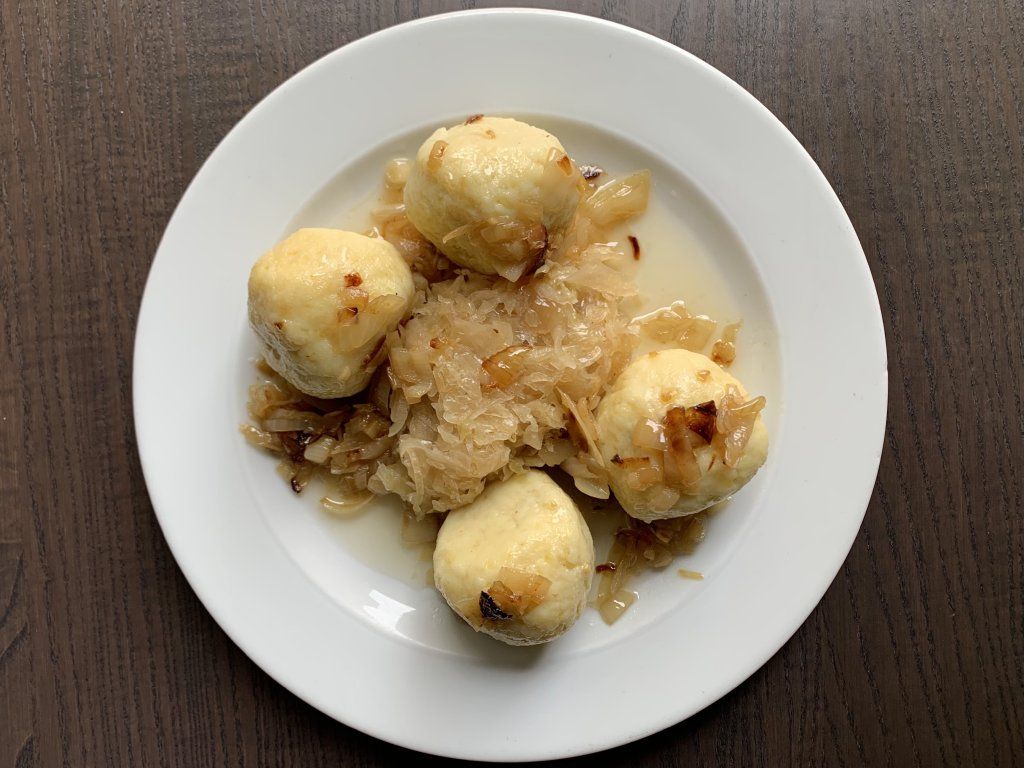 Klasické bramborové knedlíky plněné uzeným masem, se zelím a opečenou cibulkou na sádle.