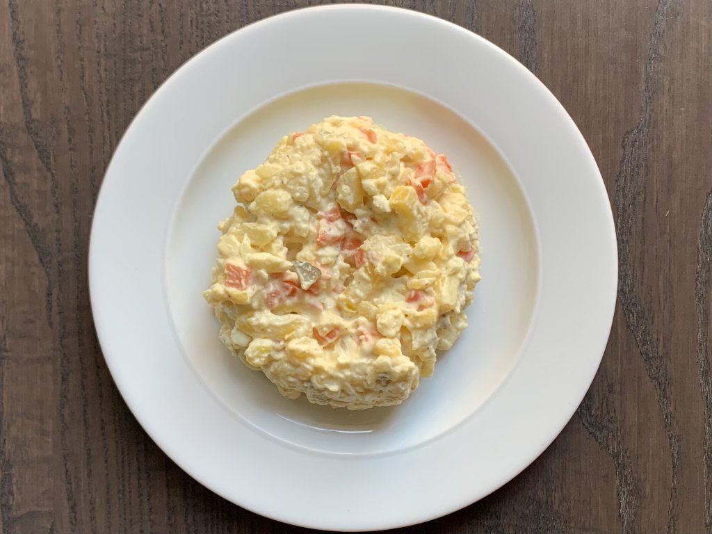 Připravený z vařených brambor, naší majonézy, kořenové zeleniny, vajec, hořčice a nakládaných okurek.