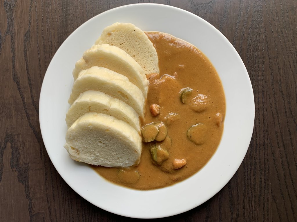 Vepřová plec na zeleninovém základu z kořenové zeleniny zjemněný smetanou se znojemskou okurkou a Pražskou šunkou. S houskovým knedlíkem