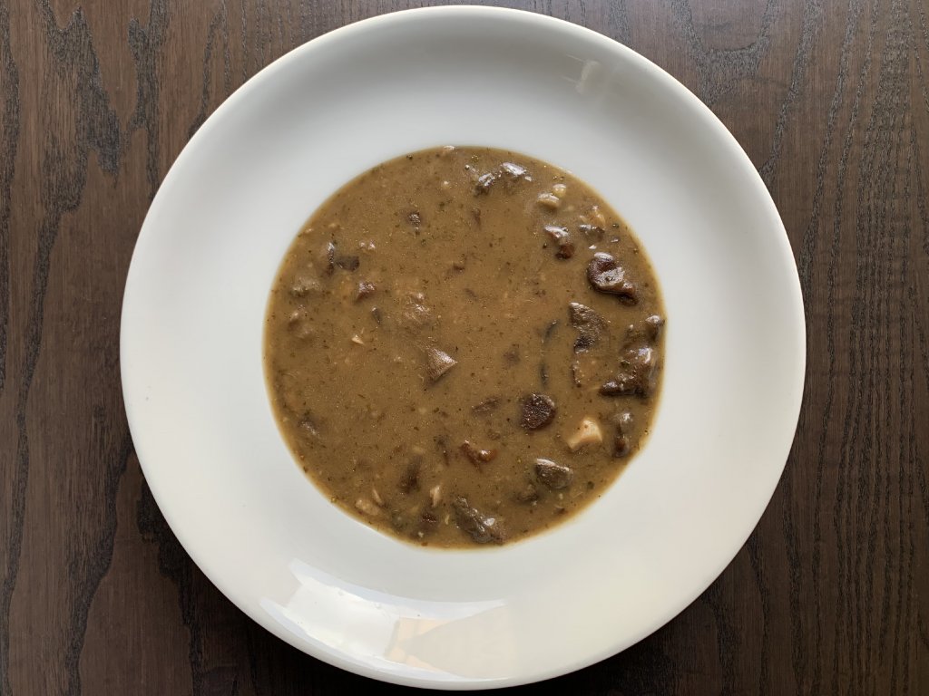 Hřibovité houby dušené na cibulovém základu, česnek, máslová jíška, zeleninový vývar.