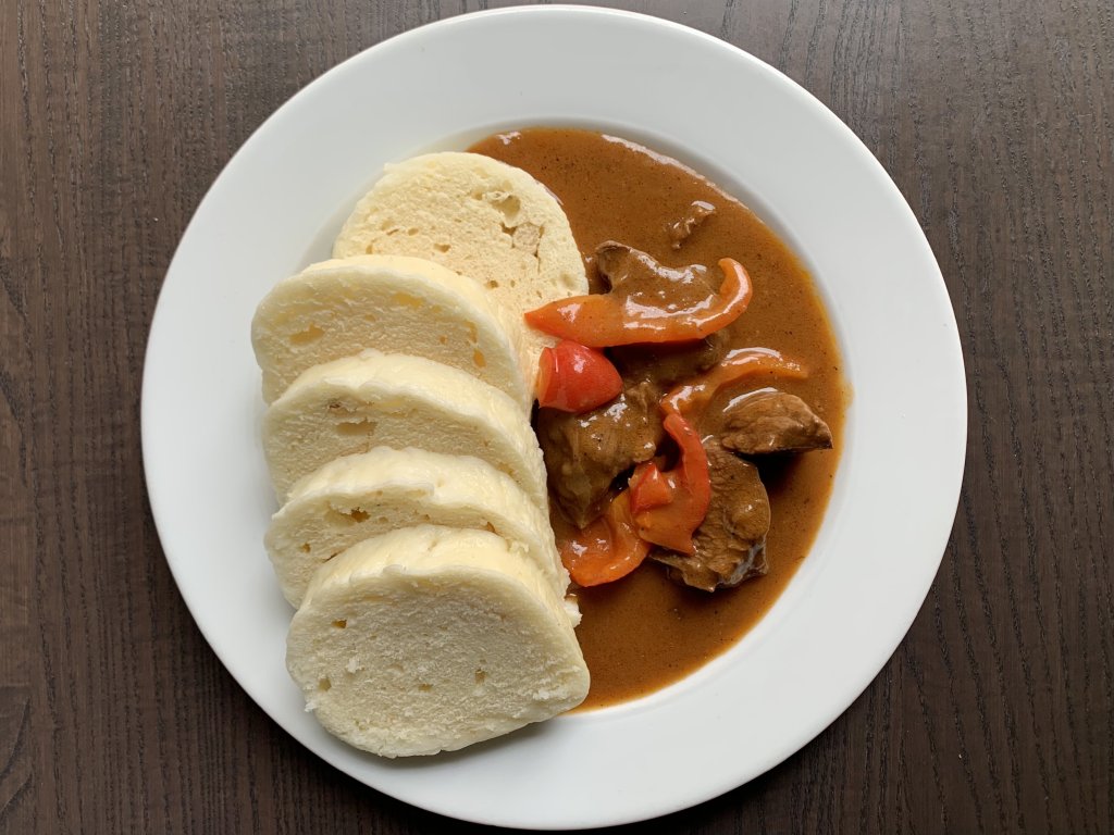 Hovězí krk na cibulovo-paprikovém základu s hovězím vývarem. S restovanou čerstvou paprikou a houskovým knedlíkem.