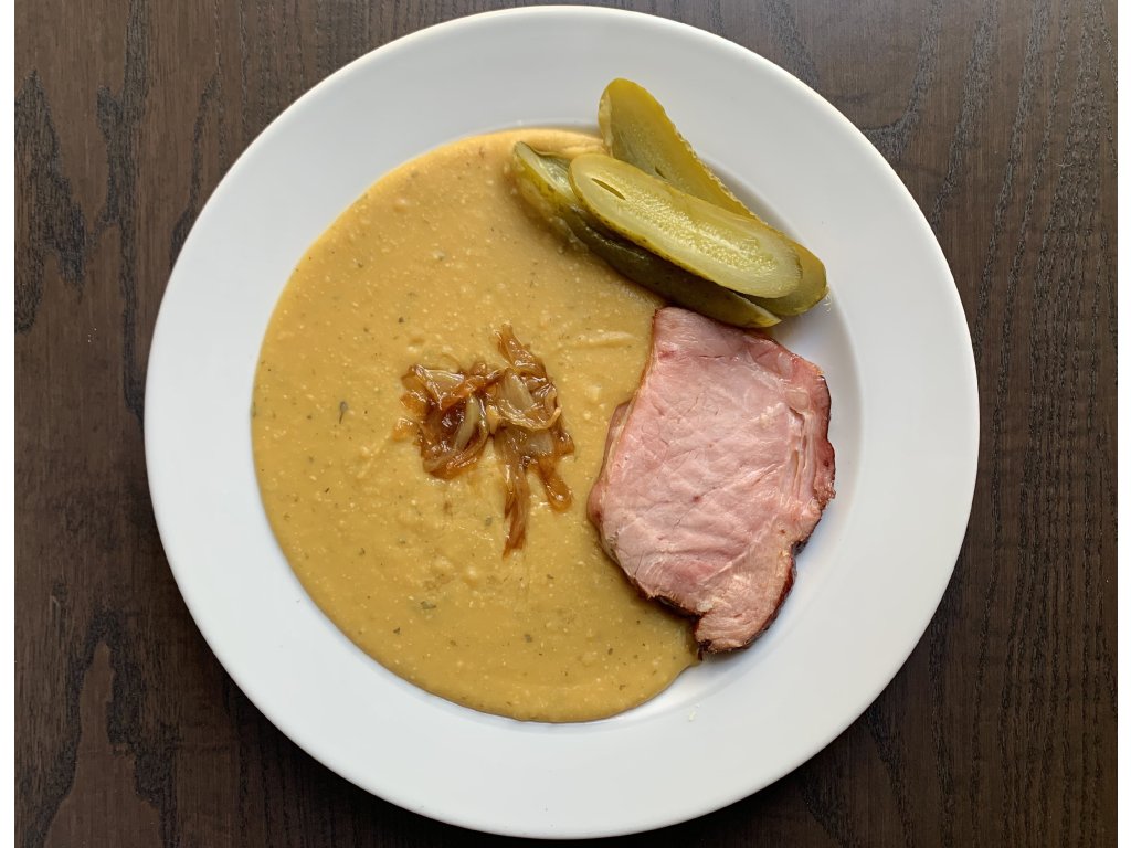 Žlutý hrách vařený ve vepřovém vývaru ochucený česnekem a majoránkou. Podáváme s uzenou krkovicí, opečenou cibulkou na sádle a nakládanou kyselou okurkou.