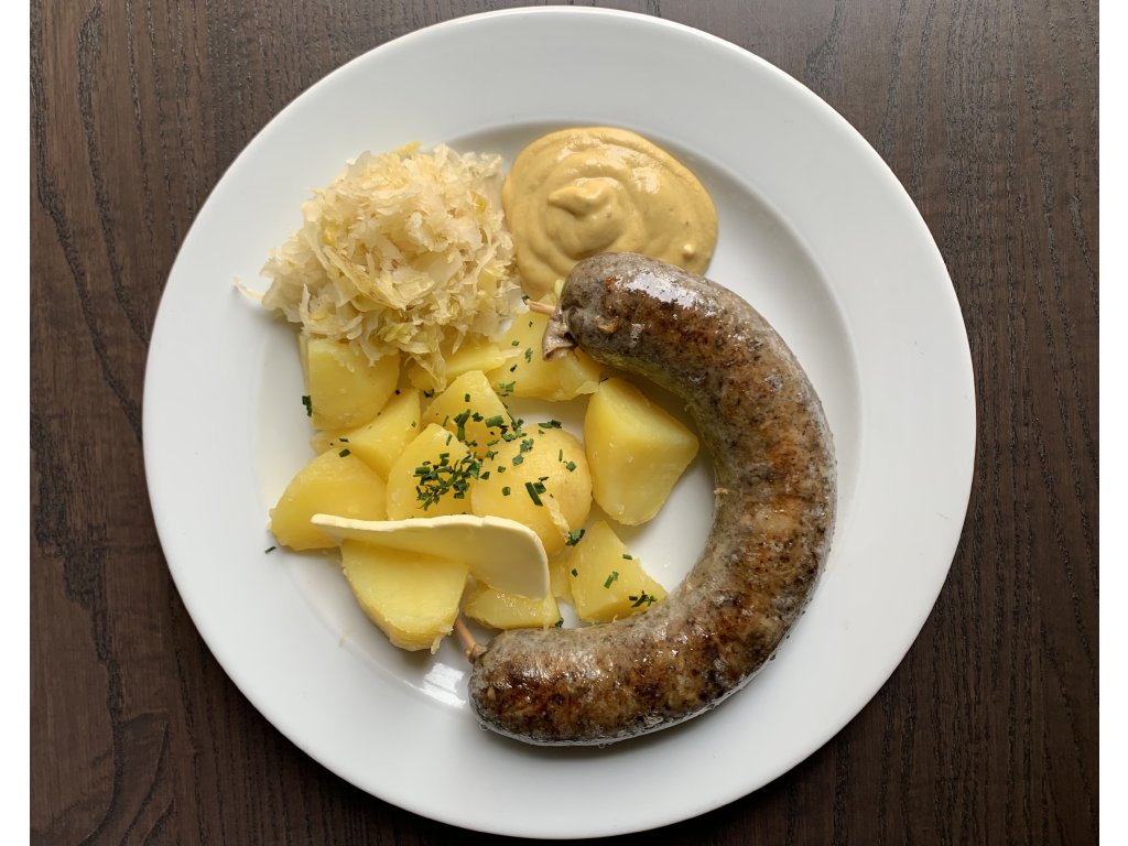 Jaternice, 1ks, kysané zelí a vařené brambory