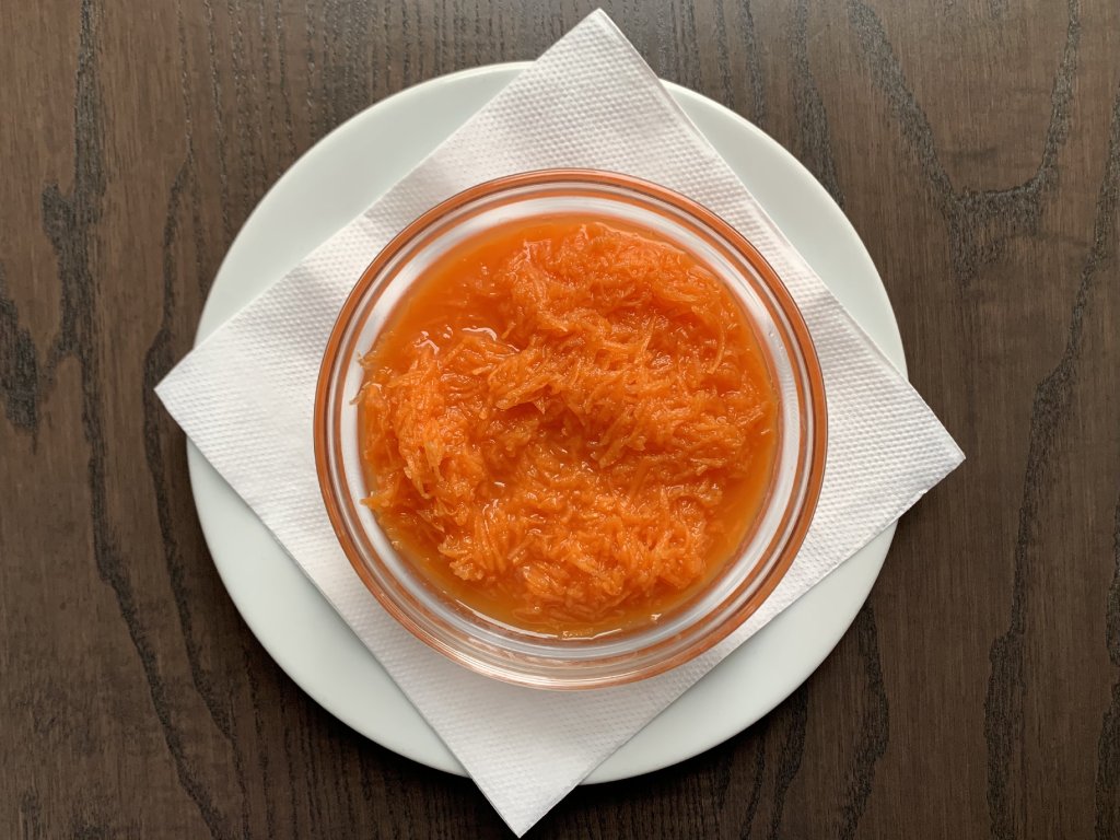 Nastrouhaná mrkev ochucená cukrem a citrónovou šťávou.