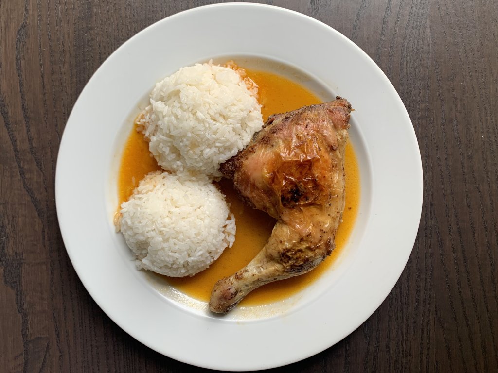 Pečené kuřecí stehno z farmy Rašovice s červenou mletou paprikou, českým kmínem a pepřem. Šťáva z výpeku s dušenou jasmínovou rýží.