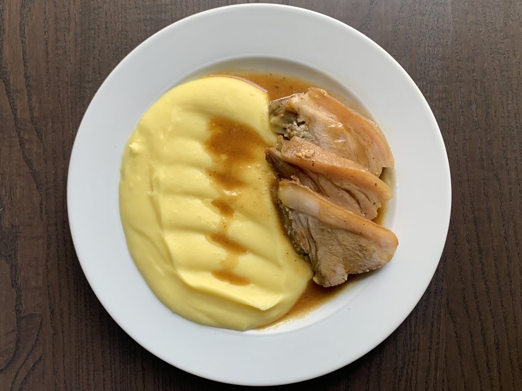 Pečené vepřové koleno se šťávou z výpeku, s bramborovou kaší.
