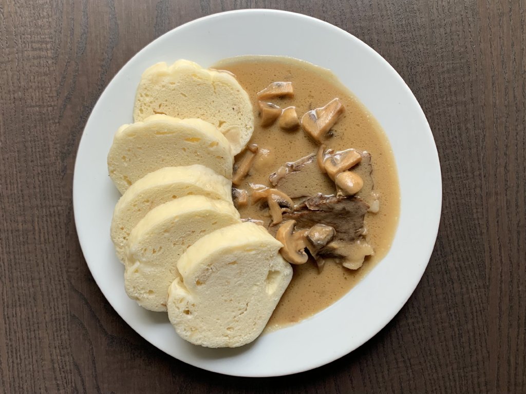 Vařený hovězí krk s omáčkou na cibulovém základu podlitá hovězím vývarem s žampiony a kapkou smetany.